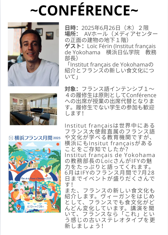 対象:フランス語インテンシブ1〜4の履修生は原則としてConférenceへの出席が当日の授業の出席代替となります。履修生でない学生の参加も歓迎します!
